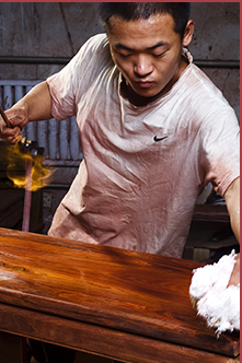 烫蜡是家具制作的最后一道工序。烫蜡之前一定要用水砂纸沾水打磨一遍,这样的好处是家具在今后的使用中不会起毛刺儿,保持永久光洁度,并使家具表面上浆快。烫蜡最好使用天然蜂蜡,传统工艺的烫蜡分为六步:溶蜡、布蜡、烫蜡、起蜡、擦蜡、抖蜡,要求达到无残蜡,不脱腊。烫蜡前要对家具进行水磨工序,这是对木性进行最后一次锤炼,待干后再进行烫蜡。烫蜡对家具的打磨是否精细也是很好的检验,如果家具留有跳跃的现象、有戗茬等瑕疵,这些都将在烫蜡后暴露无疑,而且烫蜡也是对木性含水率的最后一次烘干处理。