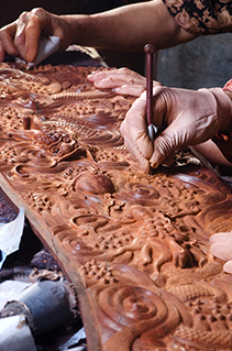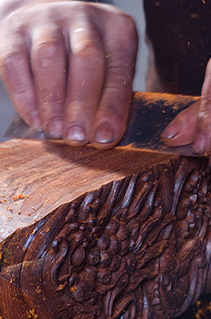 雕刻首先是打坯。根据样稿雕刻出雏形,要求要有层次感和立体感,掏、凹、拐、抹,要掌握纹理,尊敬木性,打坯细腻;然后是上细活,由手艺高超的雕刻技师在打坯的基础上,根据对画稿图案的理解进一步精雕细琢,完成整个样稿的雕刻。